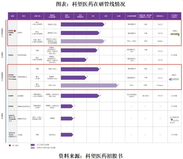 上述研发管线中,ES102为科望医药核心产品,目前进展为临床Ⅱ期,系2018年从Inhibrx授权引进;而进度最快(临床Ⅲ期)的ES104则是于2021年从Compass授权引进。